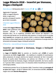 Nella Legge di Bilancio 2018, gli incentivi sulle rinnovabili e specificamente negli impianti a biomassa sono presenti e ben chiari, manca solo il DM attuativo.